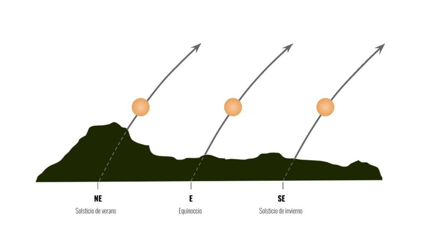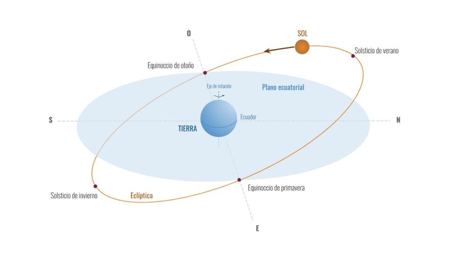 Si nos fijamos en la salida del Sol a lo largo del año, veremos que cada día parte de un punto diferente del horizonte. A lo largo de la primavera y el verano, ese punto se desplaza hacia el norte hasta que parece detenerse el día del solsticio de verano. Es en esos días cuando podemos disfrutar de la mayor cantidad de horas de luz. Después, el Sol continúa su marcha en el horizonte hacia el sur, dando paso al otoño y al invierno, con sus noches cada vez más largas. De forma análoga, en ese momento llega el solsticio de invierno, cuando el astro parece detenerse y se reanuda el ciclo anual. Esta trayectoria, que sigue el Sol en un movimiento aparente alrededor de la Tierra, es la que los astrónomos conocen como eclíptica. Aunque, en realidad, se trata de la proyección en la bóveda celeste del plano de la órbita de la Tierra alrededor del Sol.