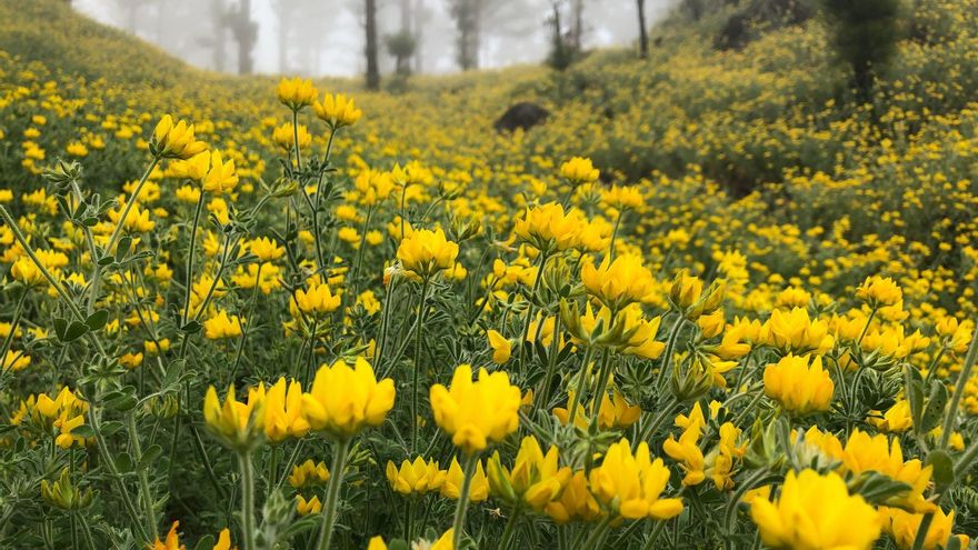 Los bosques de La Palma tienen la portentosa capacidad de brotar de sus cenizas. Dos años después del incendio en los pinares de El Paso, Fuencaliente y Mazo, una planta vivaz, el corazoncillo (Lotus hillebrandii), ha cubierto el entorno con una llamativa alfombra amarilla. La espectacular floración, esta primavera, ha engalanado el bosque quemado en 2016. Los troncos de los pinos también lucen vigorosos brotes verdes.