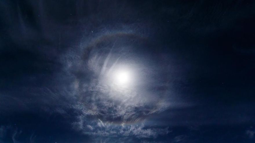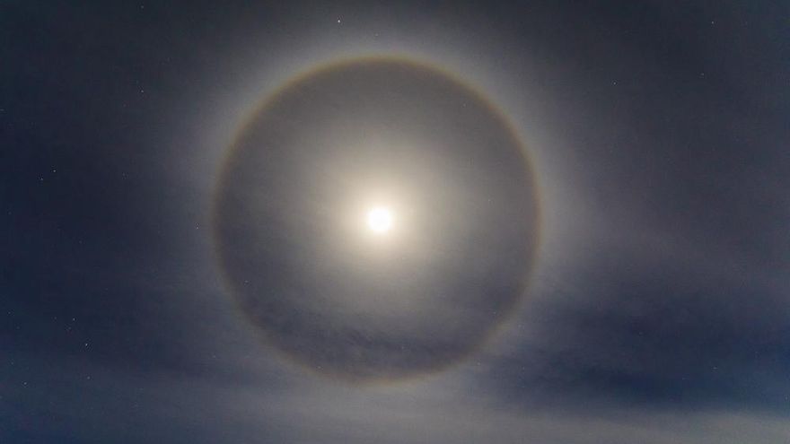 Un halo es un efecto óptico en forma de disco que se forma alrededor del Sol o de la Luna y que presenta un anillo iridiscente en su circunferencia exterior. En el caso del halo lunar, el anillo se produce cuando la luz de la Luna se refracta (se dobla) al pasar a través de cristales de hielo.