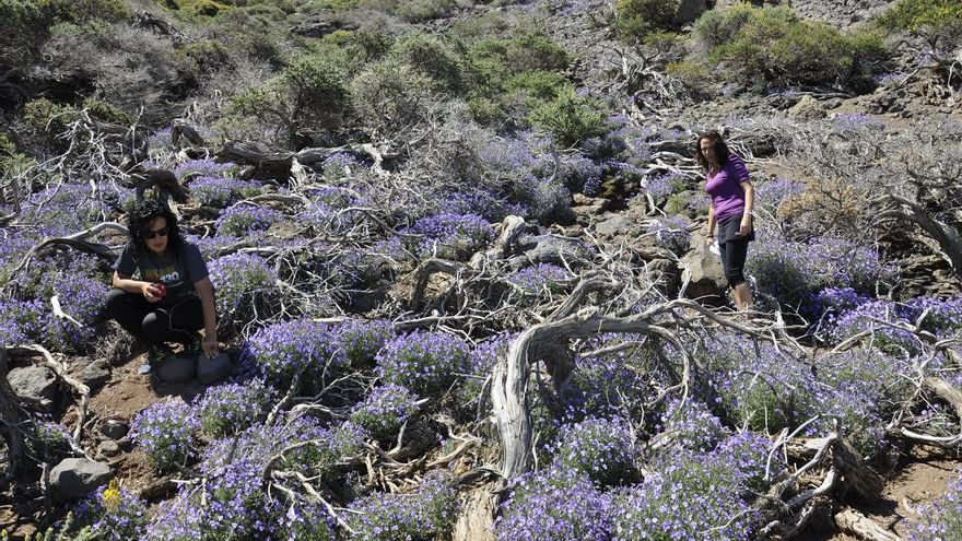 Las cumbres de La Palma es un lugar de visita obligada, pero, en esta época del año, la cita se hace imprescindible para contemplar cómo la naturaleza se muestra, en cuanto a espectáculo cromático, en su máximo esplendor. Por estas fechas, las partes altas de la Isla, a más de 2.000 metros de altitud, con el inicio de la floración de los codesos, retamones y violetas, comienzan a teñirse de amarillo fulgurante y lila. Los tajinastes rosados, con su pintoresca y esbelta impronta, también contribuyen a realzar la particularidad del entorno.