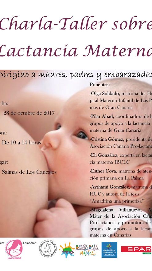 El Grupo de Apoyo a la Lactancia Materna Acerina organiza, en colaboración con el Ayuntamiento de Breña Baja, la Asociación de Empresarios de Breña Baja y Spar, una charla-taller sobre lactancia materna dirigida a madres, padres y embarazadas. El próximo sábado, 28 de octubre, de 10:00 a 14:00 horas, en Las Salinas de Los Cancajos, “celebraremos una charla-taller sobre lactancia materna dirigida a madres, padres y embarazadas, en la que contaremos con expertas que hablarán sobre diferentes temas relacionados con la lactancia”, se informa en nota de prensa.