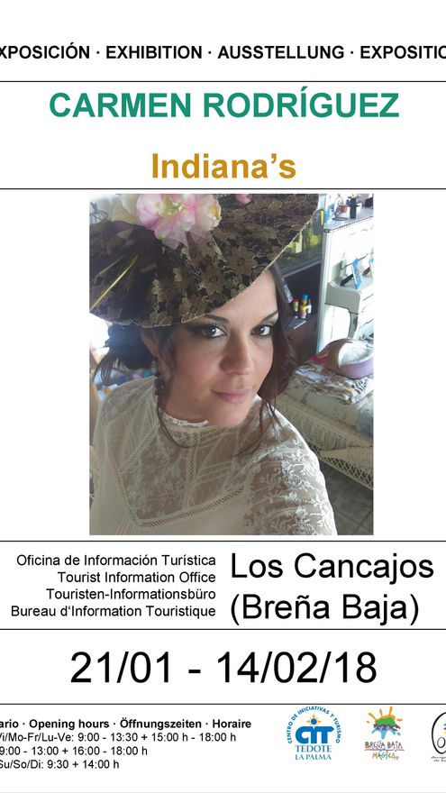 La artesana Carmen Rodríguez expone del 21 de enero al 14 de febrero la muestra de tocados Indiana's en la Oficina de Turismo de Los Cancajos,  señala en una nota el área de Animación Sociocultural del Ayuntamiento de Breña Baja. En la exposición colaboran el Ayuntamiento de Breña Baja y el Centro de Iniciativas Turísticas (CIT) Tedote.