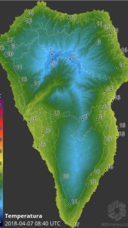 Las temperaturas, en las cumbres de La Palma, han vuelto a desplomarse y, en plena primavera, este sábado, 7 de abril, a primeras horas de la mañana, se registraba un frío invernal. En las zonas altas de la Isla el termómetro, a las 08.40, oscilaba entre 0 y 1 grados, según HD Meteo La Palma. En concreto, en el entorno del Pico de la Cruz, situado a más de 2.300 metros de altitud, marcaba 0 grados, mientras que en la zona del Roque de los Muchachos, a esa hora, el mercurio alcazaba 1 grado.