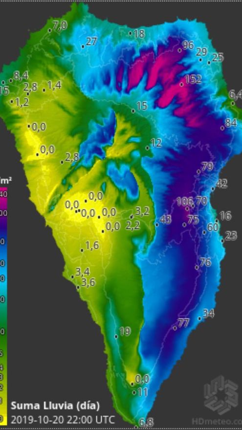 Según la citada fuente, le seguía, con 106 litros por m2, Aguacencio (Breña Alta); La Laguna de Barlovento, 96 litros; Montaña Zamagallo (Puntallana), 84; Miraflores (Santa Cruz de La Palma), 79; Tigalate (Villa de Mazo), 77; El Morro (Villa de Mazo), 76; San Isidro (Breña Alta), 75 litros; y San Pedro (Breña Alta), 70 litros por m2.