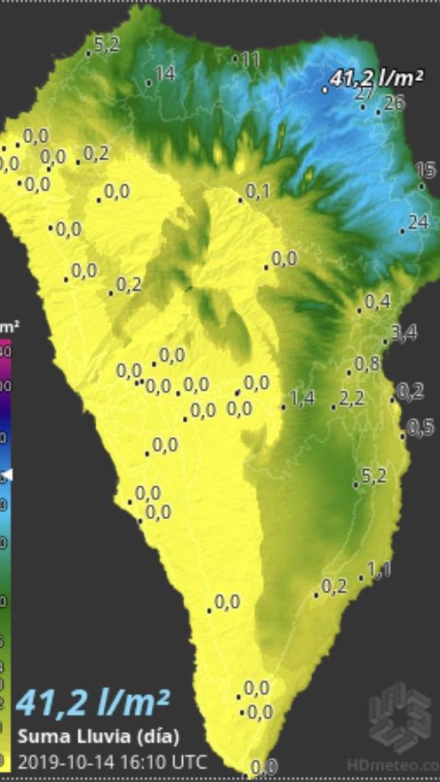 Las lluvias  han dejado  este lunes, 14 de octubre, más de 41 litros por metro cuadrado (m2) en el entorno de La Laguna de Barlovento. En concreto, hasta las 16.10 horas, en la zona se habían recogido 41,2 litros, según HD Meteo La Palma. Era el punto de la Isla donde, hasta la citada hora, los aguaceros habían sido más copiosos.