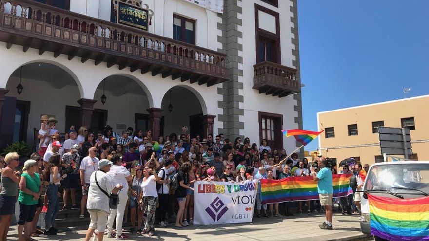 La Marcha del Orgullo LGTBi hace historia en La Palma. La Villa y Puerto de Tazacorte ha acogido este sábado la primera manifestación en defensa de los derechos del colectivo de Lesbianas, Gays, Transexuales, Bisexuales e Intersexuales, convocada por el Colectivo Violetas LGTBi La Palma, a la que se han sumado más de una veintena de asociaciones de Canarias y partidos políticos y sindicatos de la Isla. Las pintadas homófobas que han aparecido en alguna calle del municipio esta mañana han evidenciado la necesidad de seguir luchando por erradicar de la sociedad comportamientos intolerantes.