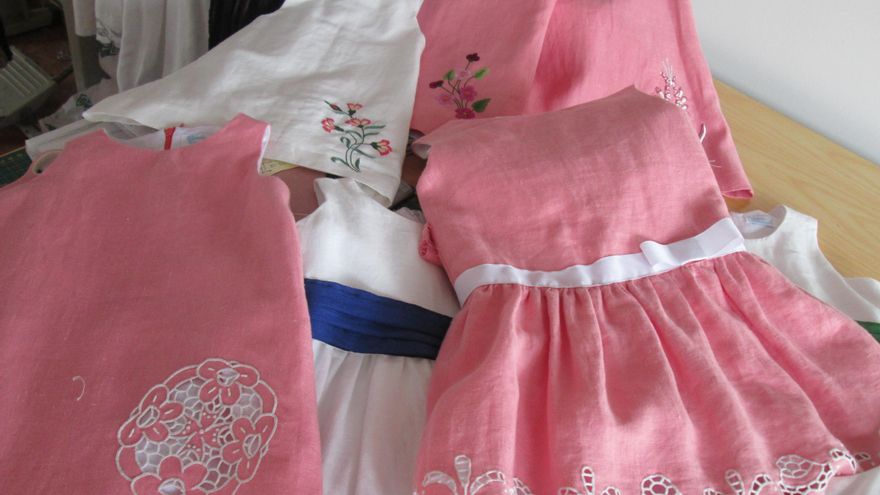 Todas las telas del interior de las prendas son “100% algodón, y los hilos también, porque la mayoría de trabajos que realizo son para niños y así evitamos alergias; el traje tiene que transpirar, ser lo más natural posible”, subraya. “Las telas exteriores son de lino y vienen de Cataluña, porque aquí no hay textil, por lo que se puede asegurar que el producto del Obradoiro es 100% español”, añade. Los vestidos de Martina “se heredan, no caducan, tienen un corte elegante, con líneas sencillas; es la fusión perfecta entre la modistería actual y la herencia del bordado en su máxima disciplina; es imposible que pasen de moda”, sostiene. “Fusiono la modistería y sastrería de mis abuelas con la tradición palmera, sería imposible separarlas”, recalca.