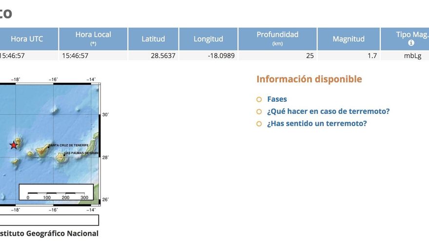 El pequeño terremoto ha sido detectado, a las 15.46 horas, a una profundidad de 25 kilómetros, en la latitud 28.5637 y longitud -18.0989.