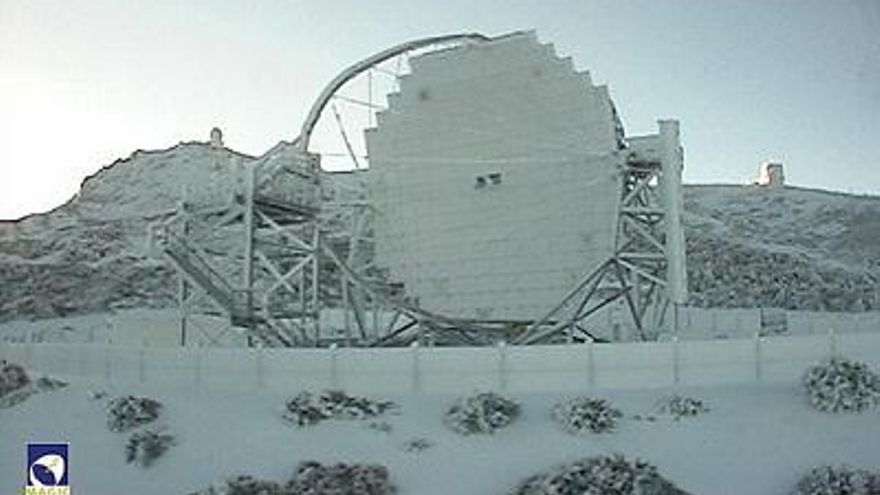 El frente de frío polar que, desde el sábado, recorre el Archipiélago canario, ha dibujado en el techo de La Palma un paisaje siberiano. “Aquí todo está helado”, señaló este domingo a LA PALMA AHORA un trabajador de la residencia del observatorio astrofísico del IAC en El Roque de Los Muchachos, situado a más de 2.300 metros de altitud. La temperatura, a las 08:30 horas de este lunes, era de 3,6 grados bajo cero (En la foto de la izquierda, este lunes, el telescopio Magic, congelado. Imagen captada de la webcam del Magic).