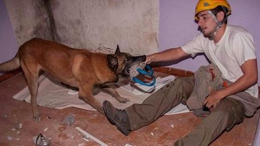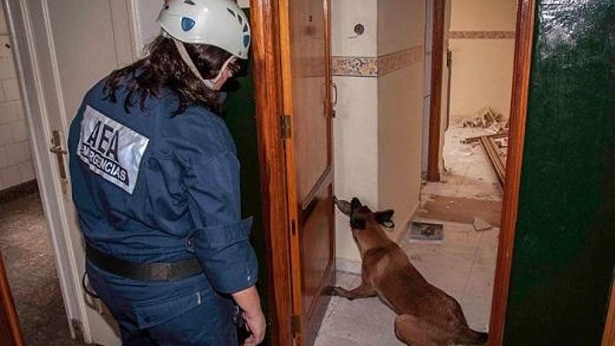 En el caso de la actividad que realizan en el antiguo Albergue Municipal, el ejercicio de los perros del grupo canino de rescate de AEA consiste en un simulacro de búsqueda y rastreo “en una estructura colapsada”, explicó el responsable del citado equipo, Luis Tomás Hernández. En concreto, dijo, se trata de encontrar a una persona supuestamente enterrada por escombros en un edificio. “Por el olor, los perros señalan el punto donde está la víctima y no dejan de ladrar hasta que llega el guía”.