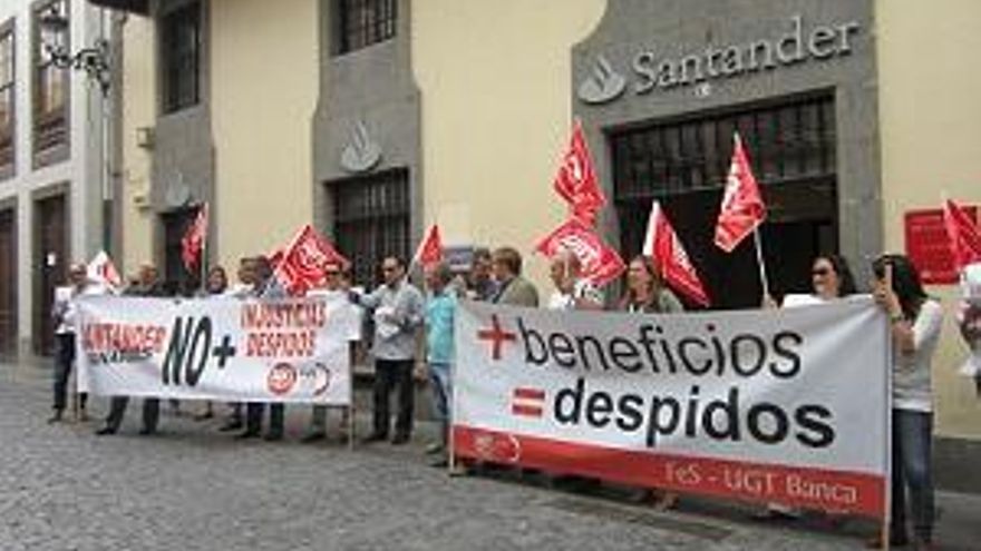 Las protestas contra las entidades bancarias han llegado a La Palma. Una treintena de empleados del Banco Santander y miembros del sindicato UGT han protagonizado en la mañana de este miércoles, en la Calle Real de Santa Cruz de La Palma, un acto reivindicativo para denunciar “los despidos injustos” y los desahucios. Los trabajadores han recorrido la céntrica vía capitalina gritando consignas en contra de la política laboral de la entidad y de los desahucios, y se han concentrado finalmente ante la oficina principal de la entidad, en la que acaban de ser despedidos dos directivos.