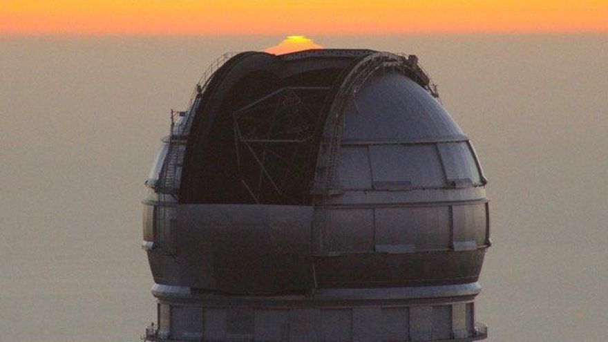 Este jueves se ha podido contemplar en El Roque de Los Muchachos, en las cumbre de Garafía, unas curiosas imágenes de la puesta del sol en la víspera del solsticio de invierno. En las instantáneas, tomadas Jesús Maíz Apellániz, investigador del Centro de Astrobiología (CAB/ESAC -Centro Europeo de Astronomía Espacial-), se ve el rayo verde como se estuviera posado sobre la cúpula del Gran Telescopio Canarias (GTC o Grantecan).