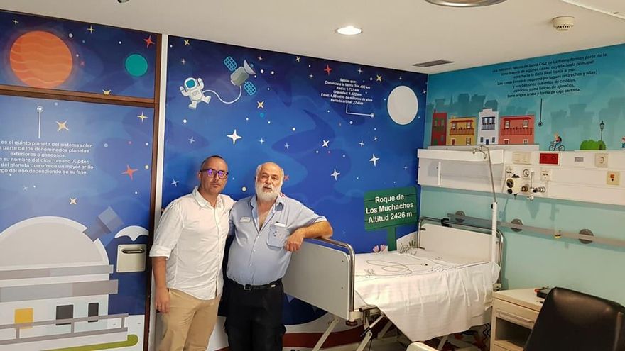 El año pasado, el motivo de la decoración fue el mundo de Disney, mientras que en esta ocasión las paredes de la habitación se han ilustrado con rincones emblemáticos de La Palma y retazos de su historia. El enano, los balcones típicos de la Avenida Marítima de Santa Cruz de La Palma, el Barco de la Virgen, la Salinas de Fuencaliente, el Complejo de Astrofísica, la Caldera de Taburiente o la graja conforman un maravilloso mundo al que los más pequeños podrán transportarse y hacer más llevadera su estancia.
