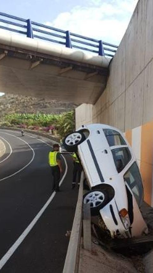 Un aparatoso accidente de tráfico tuvo lugar en la tarde de este martes en la carretera de circunvalación de Los Llanos de Aridane. Un vehículo que circulaba por la vía cayó en la cuneta y quedó con la parte delantera clavada en el hormigón, aunque la persona que lo conducía solo sufrió heridas leves, salvo complicaciones, informa Bomberos La Palma.