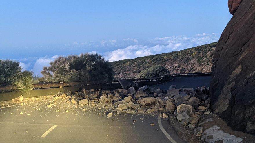 Un derrumbe invade los dos carriles en La Degollada, en el tramo de Los Andenes de la carretera del Roque de Los Muchachos (LP-4). Las piedras han caído en la vía pasadas las 21.00 horas de este sábado y algunos vehículos que circulaban en dirección a Santa Cruz de La Palma han tenido dar la vuelta y regresar por Garafía dado que las rocas desprendidas, por su volumen y peso, impedían el tráfico.