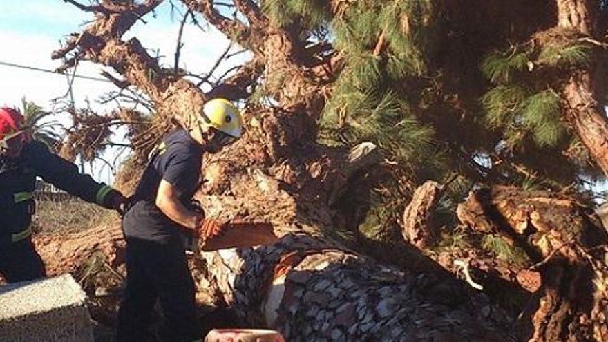 Los bomberos del Parque de La Laguna, en el municipio de Los Llanos de Aridane, tras trocear el tronco del árbol con una motosierra, han retirado este martes un imponente pino que el pasado viernes, durante el intenso viento huracanado que sopló en la comarca Oeste de La Palma, cayó sobre el garaje de una casa del barrio de Las Manchas de Abajo. El enorme ejemplar fue arrancado de cuajo por la fuerza del vendaval.