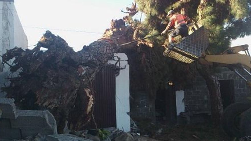 El percance tuvo lugar en horas de la noche de la citada jornada y, según Pérez, la familia que habita la vivienda, se llevó un buen susto. El pino se desplomó sobre el garaje adosado a la casa. Por la mañana, dijo, comprobaron que el árbol se había rodado hacia uno de los pajeros situado justo al lado.