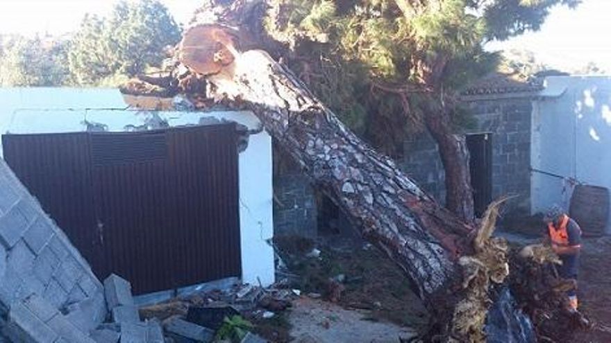 (En la imagen, los bomberos trocean, este martes, el pino caído sobre el garaje de la vivienda. Foto: BOMBEROS LA PALMA)