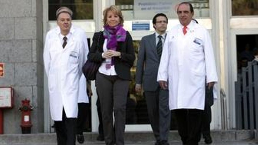 Todas estas declaraciones las ha hecho Aguirre en apenas tres minutos y rodeada del consejero de Sanidad, del doctor responsable de la operación, el jefe de la Unidad de Patología Mamaria del Servicio de Ginecología, José María Román; el jefe de este último servicio, José Antonio Vidart; el gerente del centro, José Soto; el subgerente, el doctor Javier Guerra; y el director médico, Joaquín Poch.