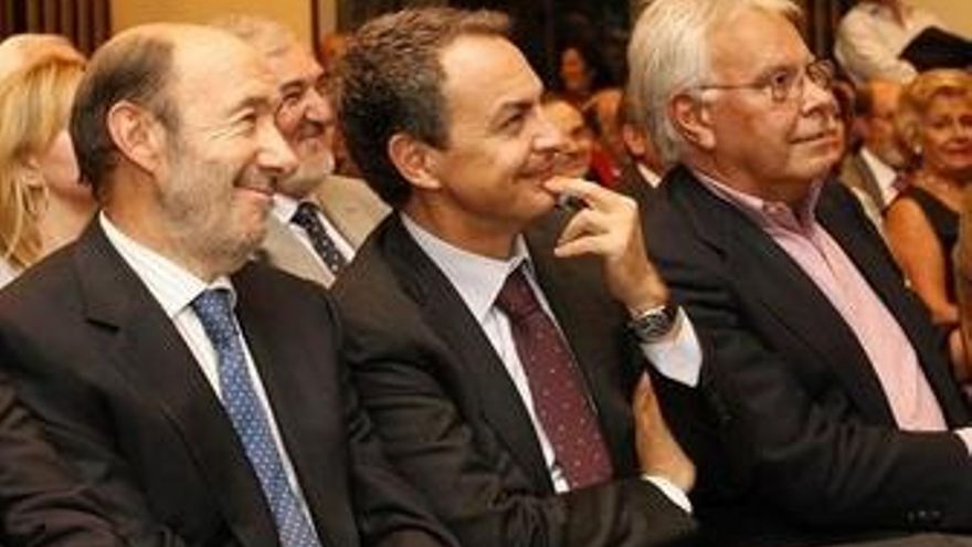 Los expresidentes del Gobierno José Luis Rodríguez de Zapatero y Felipe González y el secretario general del PSOE, Alfredo Pérez Rubalcaba, han acompañado al expresidente del Congreso José Bono en la presentación del primer tomo de sus memorias, 'Les voy a contar' (editorial Planeta).