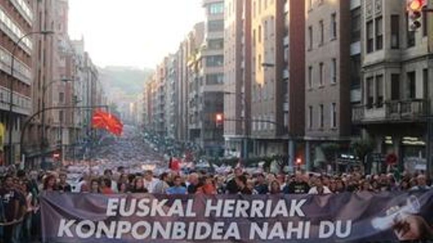 Decenas de miles de personas convocadas por los firmantes del Acuerdo de Gernika se han manifestado este sábado en Bilbao bajo el lema “Euskal Herriak konpondubide nahi du/Euskal Herria quiere una solución” para, entre otras cuestiones, dar una “solución íntegra al conflicto” vasco a “sus causas y a todas sus consecuencias”. Asimismo, han hecho “un llamamiento a los Estados español y francés a que se sienten y dialoguen con ETA” para dar salida a “las consecuencias de décadas de confrontación armada”.