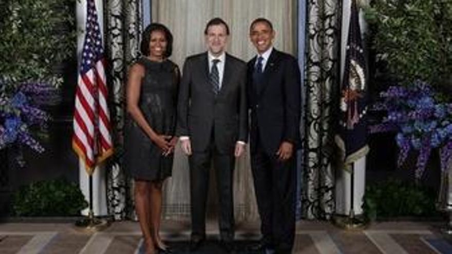 En la imagen, un sonriente Rajoy aparece flanqueado por Barack Obama y Michelle Obama durante su visita a Nueva York para participar en la Asamblea General de Naciones Unidas.
