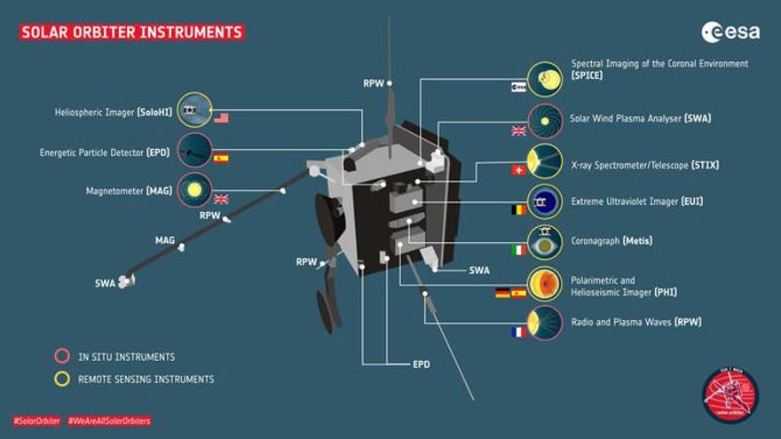 ¿Cuántos instrumentos científicos lleva?Diez: cuatro para registrar datos in situ alrededor de la nave, y seis para observar el Sol de forma remota. El primer cuarteto está formado por detectores para la observación de partículas y eventos en las inmediaciones, incluidas partículas cargadas y campos magnéticos del viento solar, ondas magnéticas y de radio del viento solar, y partículas cargadas de energía. El otro conjunto de instrumentos actúa como telescopios que observarán la superficie y la atmósfera solares. La mejor forma de ver el gas de esta atmósfera es mediante la potente emisión de rayos ultravioletas de onda corta. Así, contará con un generador de imágenes de alta resolución y del Sol completo, y con un espectrómetro de alta resolución. La atmósfera exterior se revelará mediante coronografías de ultravioleta y luz visible que ocultarán el disco brillante de nuestra estrella. Para examinar la superficie en luz visible y medir los campos magnéticos locales, también lleva un magnetógrafo de alta resolución. Solar Orbiter es la primera nave espacial que incorpora telescopios o cámaras para tomar imágenes del Sol desde tan cerca.