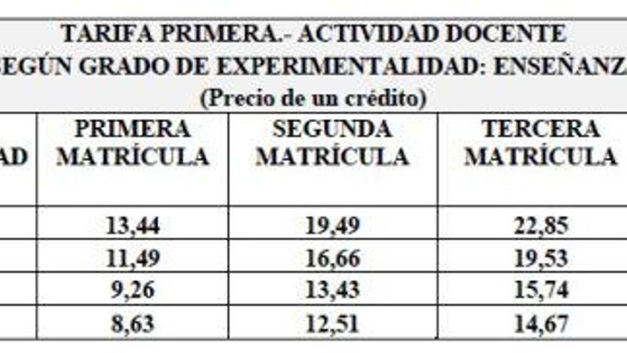 Les expongo el caso de una compañera de trabajo que estudia una carrera de grado 1 de experimentalidad. La voluntad de María era la de matricularse en tres asignaturas de seis créditos. El año pasado le hubiese salido por 241,92. Este año, aplicando los nuevos precios públicos le hubiese subido a 341,10. Sin embargo, se ve obligada a matricularse de 48 créditos y en la hoja de matrícula le aparecen las tres asignaturas con las que cree que puede enfrentarse, cinco de regalo y un importe de 1591,80. Ha pedido la matrícula a tiempo parcial. Si se la dan sólo se tendría que matricular en una asignatura de más; le saldría por 454,8, casi el doble que el año pasado en el caso de que le concedan la gracia.