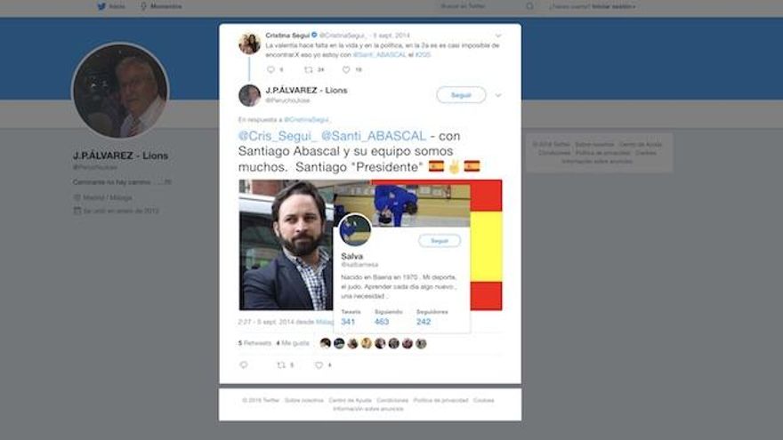 En las redes sociales, Salvador Alba ha mostrado en varias ocasiones su apoyo a Santiago Abascal, compartiendo en su cuenta de Twitter con me gusta o retuits entradas como esta de la periodista Cristina Seguí y su respuesta que se reproduce junto a esta información.
