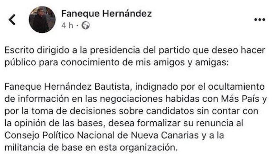 Morales reproduce una entrada en el muro de facebook de Faneque Hernández en la que este acusa a la cúpula de NC: “Indignado por el ocultamiento de información en las negociaciones habidas con Más País y por la toma de decisiones sobre candidatos sin contar con la opinión de las bases”, ha expuesto el candidato del 26M como argumento para formalizar su renuncia “al Consejo Político Nacional de Nueva Canarias y a la militancia de base de esa organización”.
