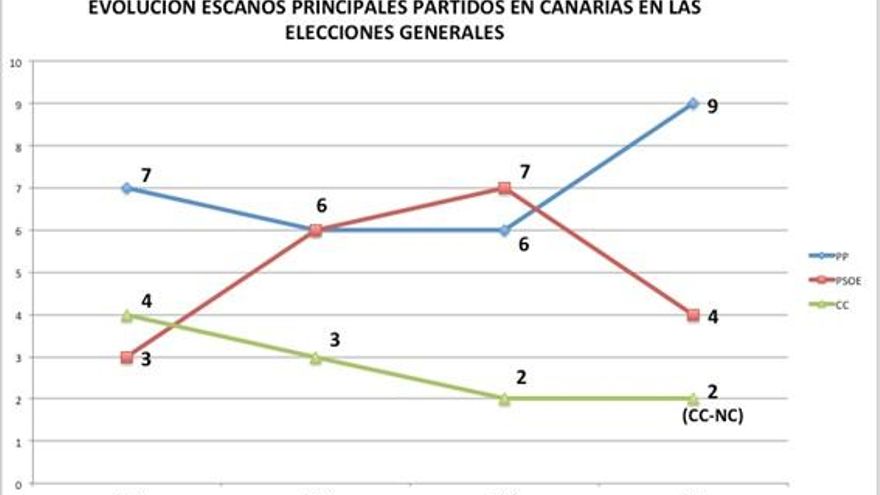 Entre los comicios de 2008 y los de 2011, el PSOE perdió 15 puntos porcentuales en el Archipiélago. El PP, por su parte, subió trece puntos. Es más difícil analizar el caso de los nacionalistas, al concurrir juntos en 2011 y por separado en 2008. Pero sí hay un dato interesante, en su feudo de las islas occidentales CC pasa del 29% de 2008 al 19% en 2011, y pierde uno de los dos escaños que tenía.