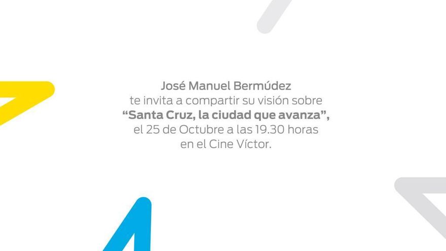 En concreto, el correo electrónico presenta dos imágenes adjuntas, una en la que muestra el logotipo del Gobierno de Canarias, como acostumbra los comunicados institucionales del Ejecutivo, y otra que reza: “José Manuel Bermúdez te invita a compartir su visión sobre Santa Cruz, la ciudad que avanza el 25 de octubre a las 19.30 horas en el cine Víctor”.