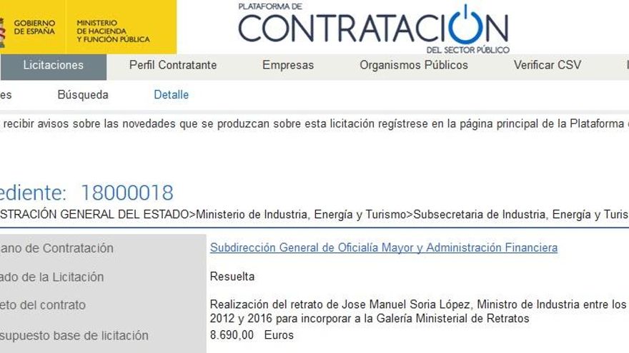 El Ministerio de Industria y Energía ha adjudicado la realización de un retrato del exministro José Manuel Soria, que dimitió en 2016 después de aparecer su nombre en los papeles de Panamá, por valor de 8.690 euros. Así consta en el Portal de Transparencia del Gobierno desde el pasado 13 de marzo.