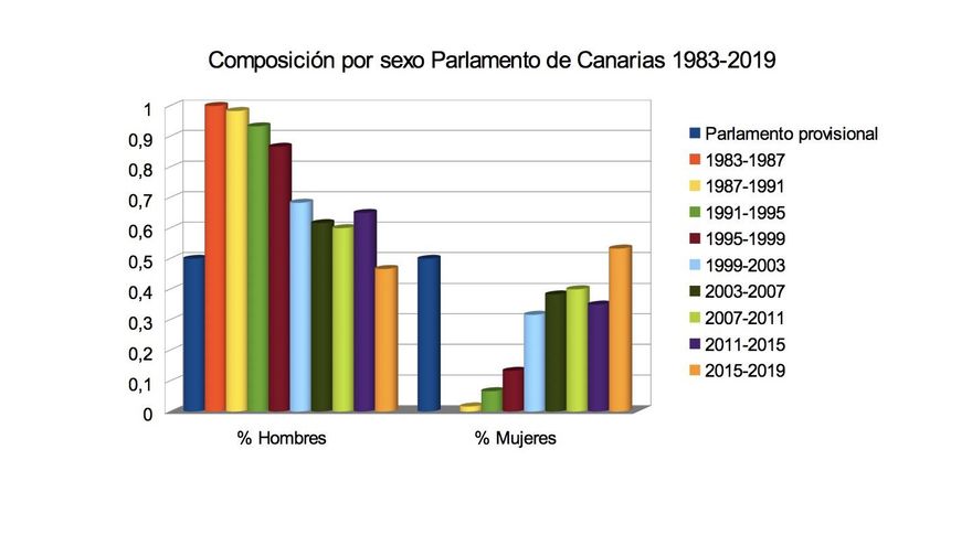 El Parlamento de Canarias puede presumir de tener actualmente el mismo número de hombres (30) que de mujeres (30) representando a la ciudadanía. Sin embargo, lograr esta estampa no ha sido un camino de rosas. En las primeras legislaturas, la presencia de la mujer fue escasa, y no ha sido hasta esta última cuando se ha notado este equilibrio. Para lograrlo, ha tenido un papel importante la cuota del 40% de mujeres y hombres en las candidaturas electorales, una medida impuesta en la Ley de Igualdad de 2007 del PSOE, que se ha unido al sistema de listas cremallera utilizado por muchos partidos para que las mujeres puedan salir elegidas y no queden relegadas a los últimos puestos.