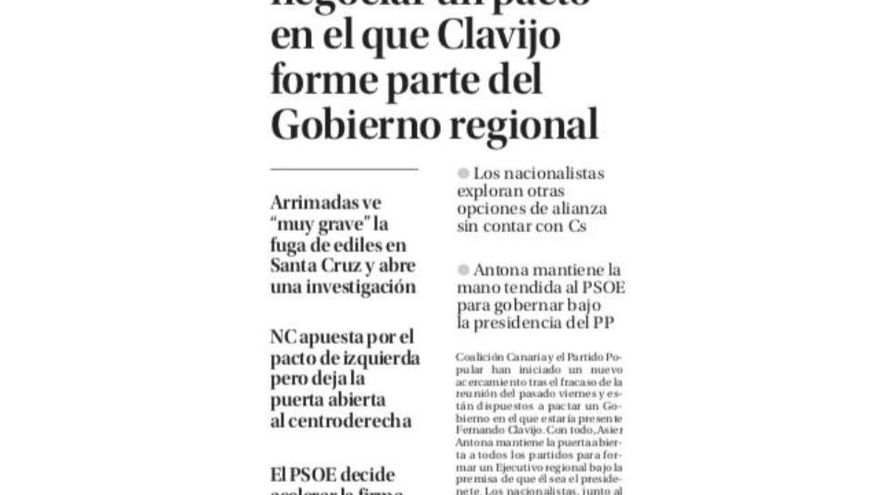 El bloque de apertura de la portada de este martes del periódico La Provincia lo decía todo acerca de los posibles pactos de gobierno que se pueden dar todavía en Canarias, pactos que, en alguna medida, también influirán en algunos de los cabildos insulares, a punto de constituirse al final de esta semana.