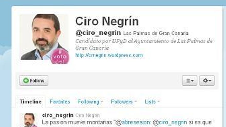@ciro_negrin es el candidato por UPyD al Ayuntamiento de Las Palmas de Gran Canaria. Cuando hace unas semanas MMI, la empresa de análisis y seguimiento de noticias en Canarias, creó una herramienta para monitorizar y elaborar un ranking de menciones de los candidatos en Twitter, este político figuraba entre los 6 primeros puestos, una posición muy honrosa, al medirse con “los grandes”, y quedando incluso por encima de muchos de los “primeros espadas” de la política insular o regional.