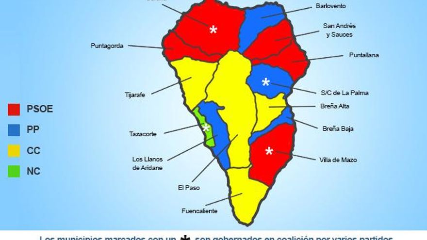 El PP tiene mayoría absoluta en Barlovento, Los Llanos de Aridane, donde gobierna una alcaldesa, y Breña Baja. Además, se hizo con la alcaldía de la capital de la isla, Santa Cruz de La Palma, en un pacto con Coalición Canaria. La formación nacionalista también gobierna en cuatro municipios, en Breña Alta, Fuencaliente de La Palma, El Paso y Tijarafe, en todos con mayoría absoluta. Tazacorte es el único municipio donde gobierna NC con el apoyo de Unión Bagañeta (UB), en una alcaldía compartida en tres años y uno UB, el último.