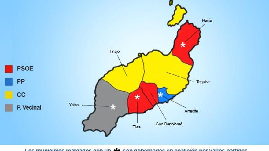 En Haría se firmó una alcaldía compartida a dos años entre el PSOE y CC, que comienza con el Partido Socialista. A pesar de que tomó posesión el candidato nacionalista, posteriormente se firmó un pacto entre las dos fuerzas. En Teguise y Tinajo gobierna CC con mayoría absoluta y, en San Bartolomé, el PSOE. En Tías, hay un pacto entre los socialistas, Podemos y Lanzarote Avanza mientras que en Yaiza, la alianza es entre Unidos Por Yaiza y CC. La capital de la isla está gobernada por el Partido Popular, con Astrid Pérez al frente, apoyada por los concejales del PSOE y los dos de Somos Lanzarote-Nueva Canarias.