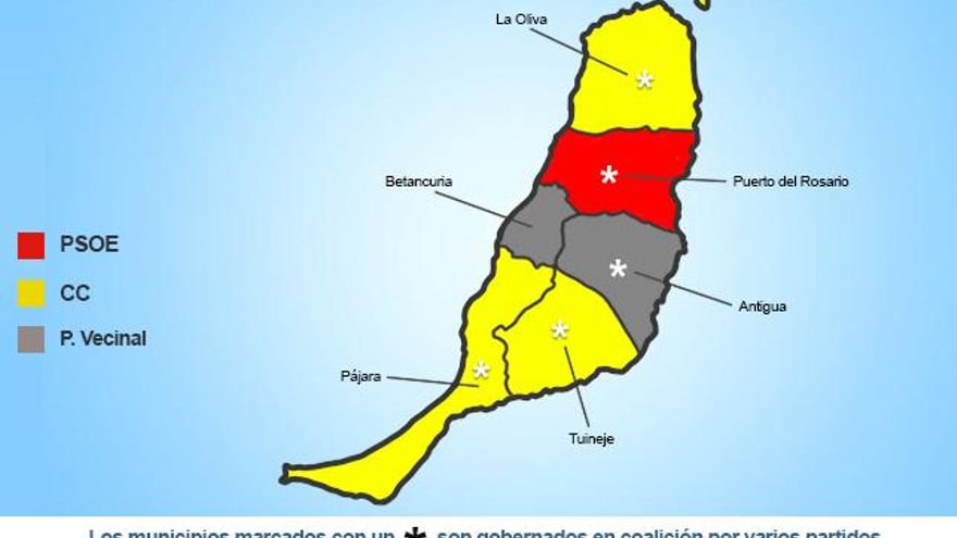El Cabildo de Fuerteventura fue una de las sorpresas en estas semanas. Tras prosperar la moción de censura a la candidata y ganadora de las elecciones de CC, el socialista Blas Acosta se hizo con la presidencia con el apoyo de Nueva Canarias, en alianza con Asambleas Municipales de Fuerteventura AMF-NuevaCanarias, y Podemos. Coalición Canaria gobierna además en tres municipios gracias a un acuerdo con diferentes fuerzas. En La Oliva pactó con NC y la agrupación local Gana Fuerteventura; en Tuineje, con el PP, siendo el único ayuntamiento presidido por una mujer. En Pájara, lo hizo con Nueva Canarias y el Partido Popular.