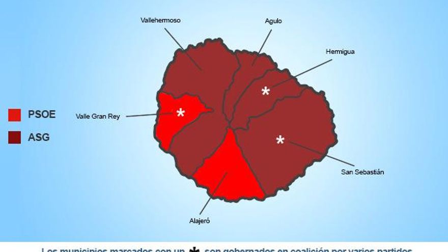 Además, su agrupación gobierna en cuatro municipios gomeros. Dos de ellos con mayoría absoluta, Vallehermoso y Agulo, este último con una alcaldesa. En la capital de la isla, San Sebastián de La Gomera, y en Hermigua cerró un acuerdo con Nueva Canarias. En los dos municipios restantes gobierna el PSOE. En Alajeró lo hace con mayoría absoluta y en Valle Gran Rey en un tripartito con Nueva Canarias y Sí Se puede.