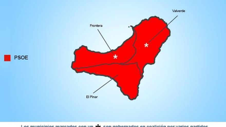 El PSOE también ha conseguido presidir el Cabildo de El Hierro. El socialista Alpidio Armas tomó posesión del cargo como presidente de la Corporación insular de la isla de El Meridiano, con el objetivo de evitar “el maltrato” de la Isla. Sucede en el cargo a la nacionalista de CC Belén Allende. Los tres municipios herreños también están gobernados por el PSOE. En El Pinar de El Hierro los socialistas lograron la mayoría absoluta, en Valverde, pactaron con Nueva Canarias y en La Frontera con el Partido Popular.