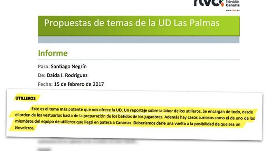 La segunda tarea, la de “elaboración de informes y estudios de apoyo a la toma de decisiones” del presidente de RTVC, tampoco parece haber sido uno de los fuertes de la flamante directora de Relaciones Institucionales de la casa. Según los datos aportados por RTVC, entre su nombramiento, en mayo de 2016, y octubre de 2017 emitió en total cinco informes, muy pocos de ellos catalogados como informes previos a la toma de decisiones. Salvo que se quiera tomar como tal uno de 245 palabras fechado el 15 de febrero de 2017 bajo el epígrafe “Propuestas de temas de la UD Las Palmas”, que entre otras sugerencias incluye la de “un reportaje sobre la labor de los utilleros”, un “tema” que Daida Rodríguez califica como “el más potente que nos ofrece la UD”.