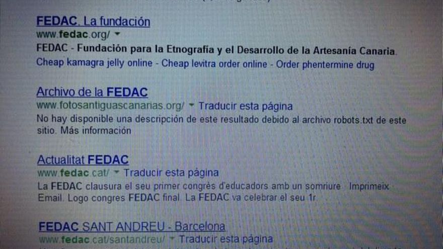 Un virus informático se ha colado en el Cabildo de Gran Canaria en forma de la famosa viagra. O al menos, en la web oficial de la Fundación para la Etnografía y el Desarrollo de la Artesanía Canaria (FEDAC), cuando por sus siglas se hace una búsqueda en google y baja las mismas aparecen promociones publicitarias de los componentes genéricos del estimulante sexual para hombres.