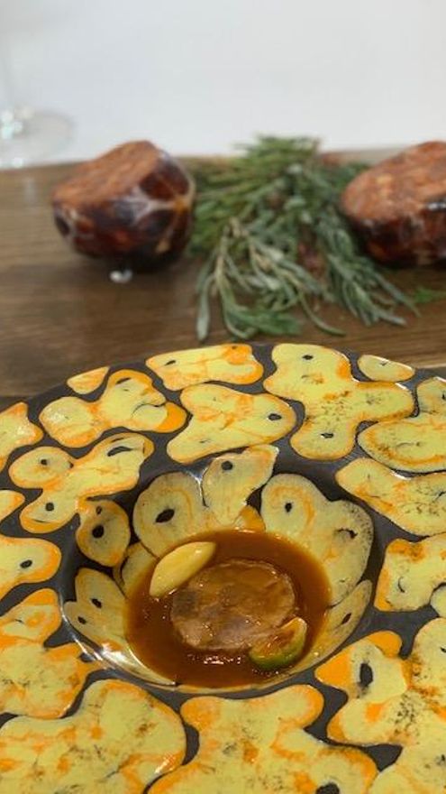 En ese momento Paco, concierge de la casa, me acompaña al edificio principal, el gran Molino que acoge lo más importante del establecimiento. Nada más atravesar esas puertas observas a través de las ventanas cómo esta casa, y por ende el comensal, se funden en un elemento más de las marismas. Con las mareas cambiantes según el día y la hora que lo visites, cada momento aquí es único. La gran pared donde observamos una de las grandes creaciones de Ángel como son los embutidos marinos, preceden a la gran cocina a la vista donde puedo observar al chef, acompañado con su jefe de cocina actual, Luis Callealta.