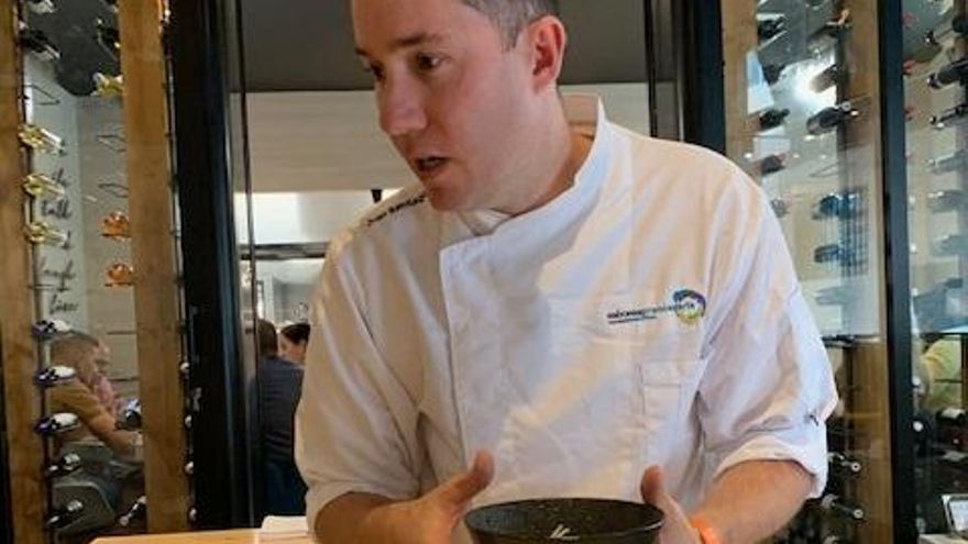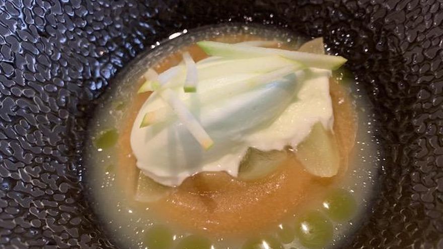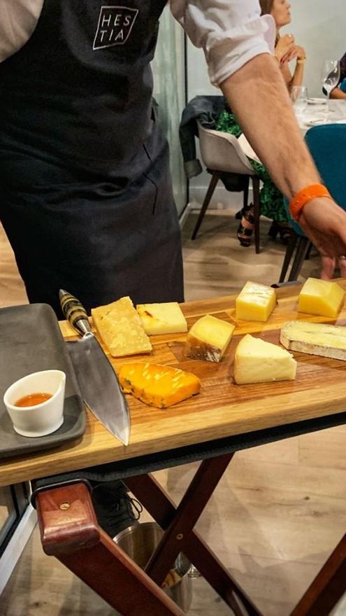 Pero Juan se guardaba un as de oro en la manga, los quesos, otra de las pasiones de estos jóvenes chefs que en esta casa cobran un protagonismo esencial en la propuesta. Aunque Hestia tiene varios quesos de Gran Canaria, y me congratulo de ello, me decanté por probar algunos externos que desconocía en una tabla que, si me la sirven al principio del almuerzo, la repito en bucle hasta el final. Comté de dos maduraciones diferentes abren el fuego, pero la traca auténtica llega enforma de un horbier francés (leche cruda de vaca), y, sobre todo, por un queso inglés, Shropshire, que proveniente de leche pasteurizada de vaca, conformó un auténtico descubrimiento. Un deleite para los amantes del queso.