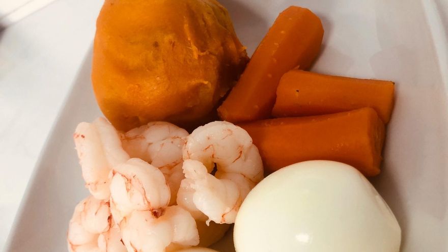Cocemos la batata con piel y muy atentos de no pasar la cocción, que será rápida, ya que si la pasamos quedará deshecha y no queremos eso. Podemos cocer a continuación la zanahoria en esa misma agua, mientras que los huevos serán cocidos durante 12 minutos. En un cazo aparte llevamos agua con sal a ebullición y cuando hierva introducimos los gambones durante únicamente 2 minutos, ya que queremos mantener la textura crujiente de los mismos y que no se nos pasen. Al sacarlos los pasamos a un recipiente previamente preparado con agua y hielo para cortar la cocción rápidamente.