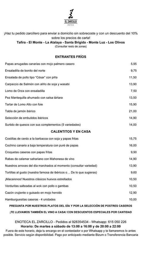 En los límites de Las Palmas de Gran Canaria y subiendo hacia Santa Brígida son los amigos de la Enoteca el Zarcillo los que se están encargando de cocinar para un núcleo de población que está recibiendo con cariño e ilusión los pedidos. Es importante destacar que trabajan de martes a sábado y que están pidiendo que se les hagan los pedidos con un servicio de antelación, es decir, si los quieren para almorzar, llamen temprano por la mañana o incluso la noche antes, y si los quieren para cenar, intenten avisar antes de las 16.00 horas. Para los pedidos, contactar a los teléfonos 928354534 o por el WhatsApp al 615.050.226.