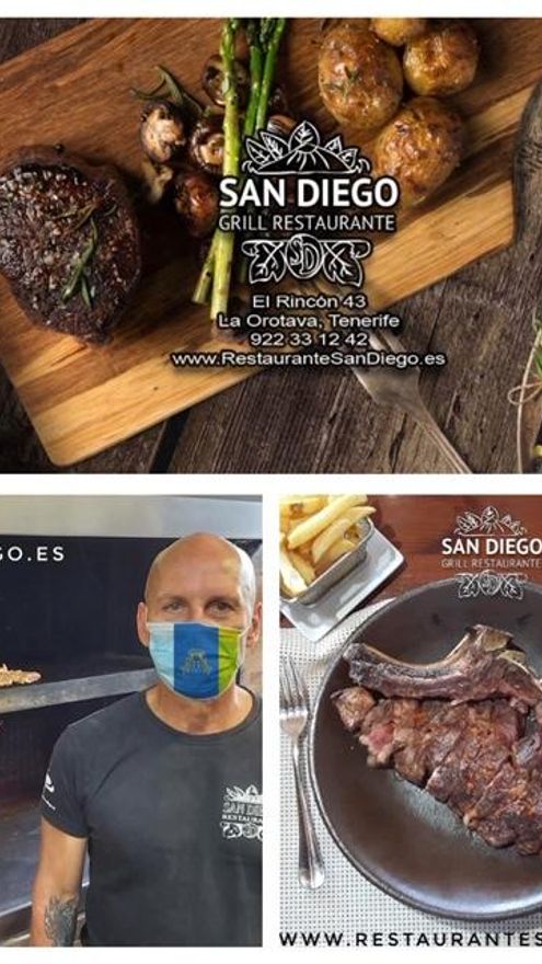 Restaurante San Diego: En La Orotava, Tenerife, su emblemático chef y propietario, Isidro, despliega el arte que sólo algunas manos tienen a la hora de trabajar las brasas. Aquí manda la parrillada de carne canaria en forma de pollo, bistec de cerdo, solomillo, entrecot, chistorras, morcilla o conejo.