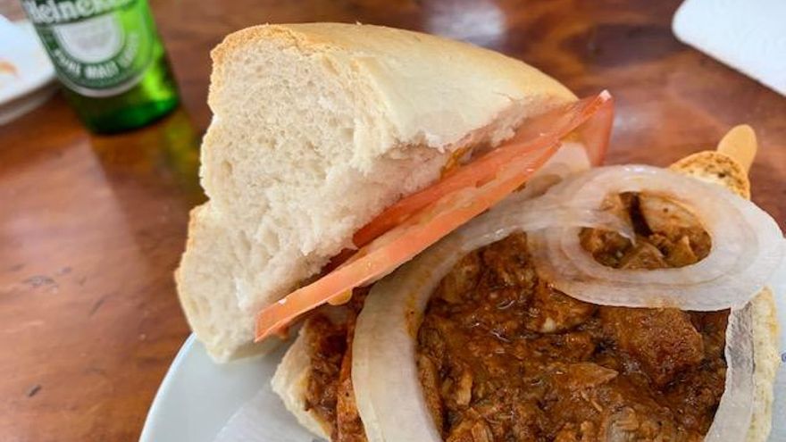 Ante la pregunta de cómo surgió en un sitio tan de mar como este un elaborado como la carne mechada me cuenta que “la idea surgió de mi mujer, que es quien la sigue cocinando a día de hoy todas las semanas. Una vez a la semana, ella sigue elaborando la carne mechada casera para la que usa unos 40 kilos de ternera, sus hierbitas, verduritas, pin pan que tampoco te voy a dar la receta (risas) y listos para los próximos días”. Ahora es David quien apostilla que “la elabora en bloque para poder congelarla y tenemos para una semana de servicio. Cada día sacamos dos calderos que duran poco, de hecho, tú te estás comiendo uno de los últimos bocadillos que serviremos hoy. Aquí nos visita gente de la isla, pero también muchos de otras islas como Gran Canaria, que cuando vienen a trabajar a la Dársena, hacen de nuestra casa su primera parada. Nosotros abrimos a las 5.45 de la mañana y cerramos a las tres de la tarde, o cuando se acabe el pan, lo que llegue antes”.