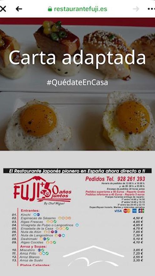 FUJI: El primer restaurante japonés que se abrió en España y qué tras 52 años con sus puertas abiertas, no va a dejar que nada lo pare. Sin duda, un aliciente de lujo que es un emblema de la cocina japonesa y que puede ser degustada en casa, todo bajo la elaboración y creación de su alma máter, Miguel Martínez. Para reservas, mirar su página web, www.fuji.es